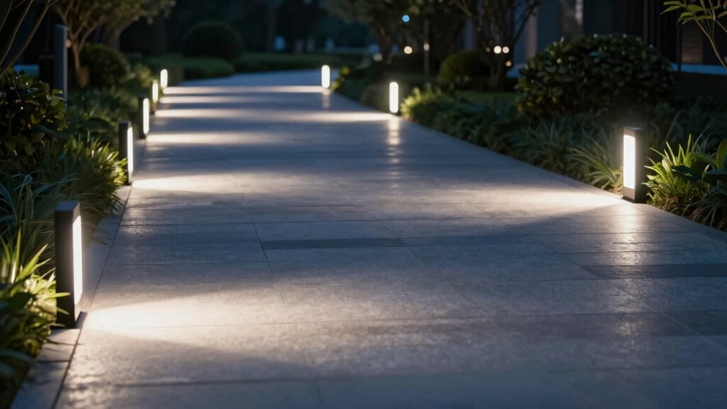 To guarantee your pathway lights provide effective illumination and enhance safety, focus on their installation and placement carefully. Proper fixture placement ensures even light distribution, reducing dark spots that cause trips. Think about aesthetic considerations, choosing fixtures that blend with your landscape while providing sufficient brightness. Position lights along the edges of walkways, approximately 12-24 inches apart, to create a clear path. Avoid placing fixtures too close to each other or directly in the line of sight to prevent glare. Consider angles that highlight key features and avoid shadows. Here’s an example of ideal placement: