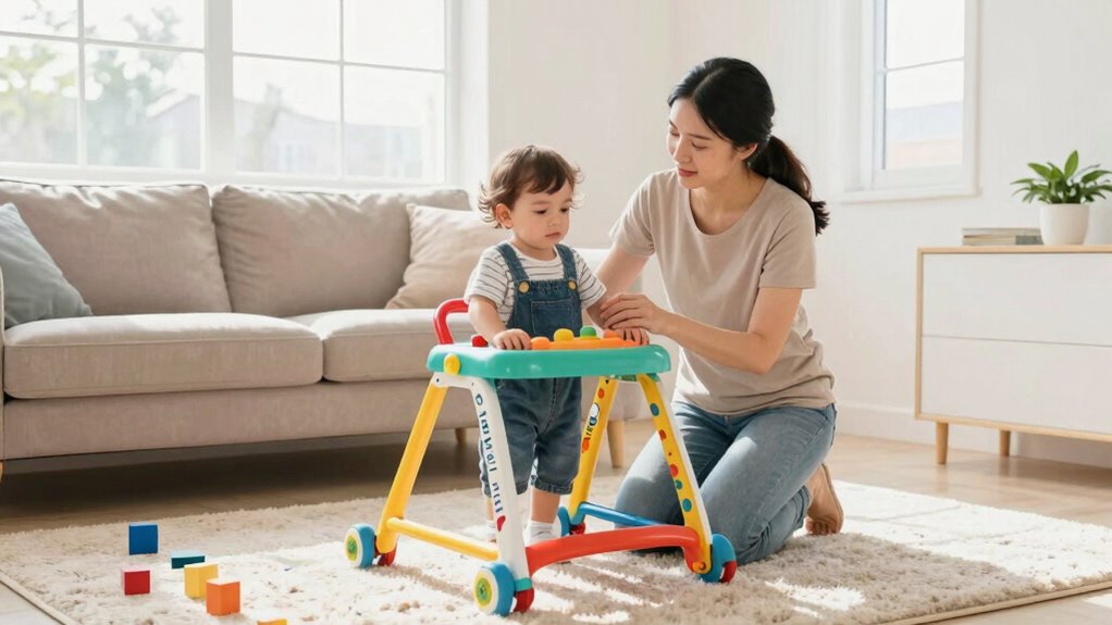 You can involve your child in creating safety rules by encouraging child participation and making rule collaboration fun. Sit down together and ask for their ideas on safe walker use, listening carefully to their thoughts. Explain why certain rules are important, and let them help craft simple guidelines. This approach fosters responsibility, makes them more likely to follow the rules, and helps them understand safety is a team effort.