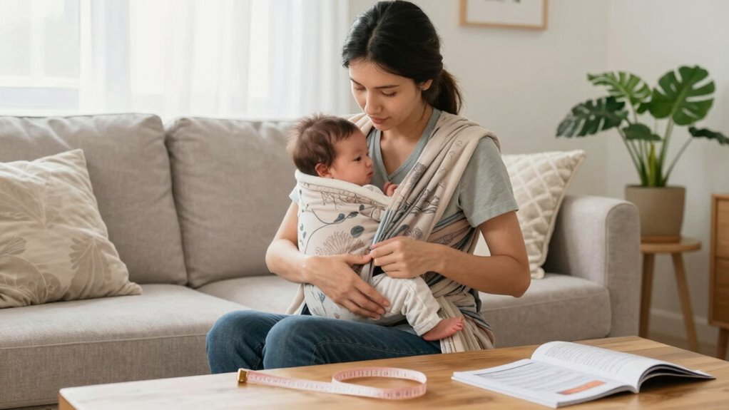 Getting the right fit for your babywearing sling starts with accurate measurements. First, measure your shoulder width and torso length to guarantee ideal comfort. Different sling fabric types, like cotton or linen, may affect how snugly the sling fits, so factor that in. Remember, a well-fitted sling enhances babywearing safety by providing proper support for your little one. When measuring, consider your body shape and any clothing you’ll wear underneath. Don’t forget to check the sling’s width; it should cradle your baby while distributing weight evenly across your shoulder. Taking these measurements seriously will lead to a more enjoyable babywearing experience for both you and your child.