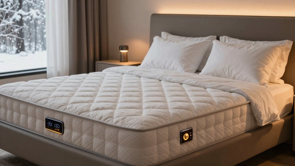 When it comes to heated mattress pads, finding the right size and fit is just as important as guaranteeing safety. You’ll want to take into account the various sizes available, like Twin, Full, Queen, King, and California King, to match your mattress dimensions. Don’t forget about depth—options can accommodate mattresses ranging from 15 to over 21 inches thick. I find that many heated pads come with elastic skirts or deep pockets to secure them in place, preventing any slipping or bunching. Choosing the right size guarantees ideal coverage and warmth distribution. If you’re going for a larger size, look for the dual control feature, which lets you set individual temperatures on each side of the bed.