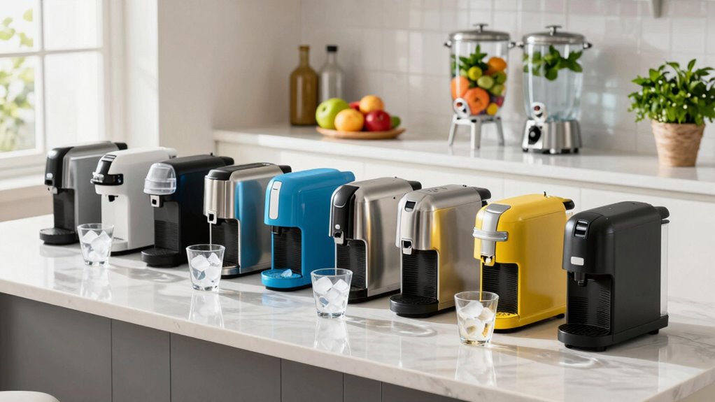 Seniors need quick access to ice for their hydration, and that’s where ice production speed comes into play. When choosing an ice maker, I look for machines that can produce ice in as little as 3.5 to 10 minutes. Some models make 9 ice cubes every 6 minutes, ensuring I have a steady supply for multiple drinks. High-capacity options are also appealing, generating up to 40 pounds of ice daily—perfect for gatherings or everyday use without constant refills. I appreciate machines that start producing ice within 5 to 15 minutes, enhancing my experience. Quick ice production not only meets hydration needs but also encourages me to enjoy more invigorating, cold beverages.