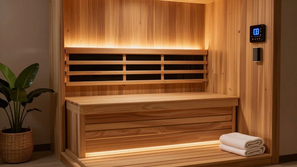 Choosing the right infrared sauna for home use involves understanding key heating technologies that can enhance your experience. I’ve found that saunas typically use carbon or ceramic heating panels, with carbon panels offering better heat distribution and lower EMF levels, which is essential for a safer session. Some models heat up to 149°F in just 10-15 minutes, making them incredibly efficient. I also love saunas with advanced features like foot heating, as it boosts comfort and improves circulation. Plus, low EMF technology minimizes exposure to electromagnetic radiation, adding to the safety. Many saunas even include chromotherapy options, using colored lights to elevate the therapeutic effects of the heat, helping me relax even more during my sessions.