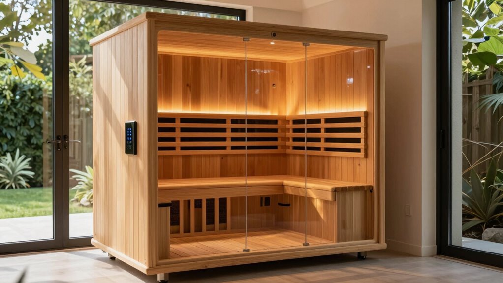 Safety features are important, but smart connectivity can truly enhance your infrared sauna experience. With WiFi and Bluetooth control, I can operate my sauna remotely through a mobile app, which fits perfectly into my busy lifestyle. I love that I can adjust settings like temperature and session duration before I even step inside. Many models even offer dual connectivity options, giving me flexibility in how I control my sauna. Plus, some come with built-in chromotherapy lighting, which I can customize through the app for a more personalized wellness experience. Regular software updates keep the sauna functioning at its best and often introduce exciting new features, ensuring I get the most out of my investment.