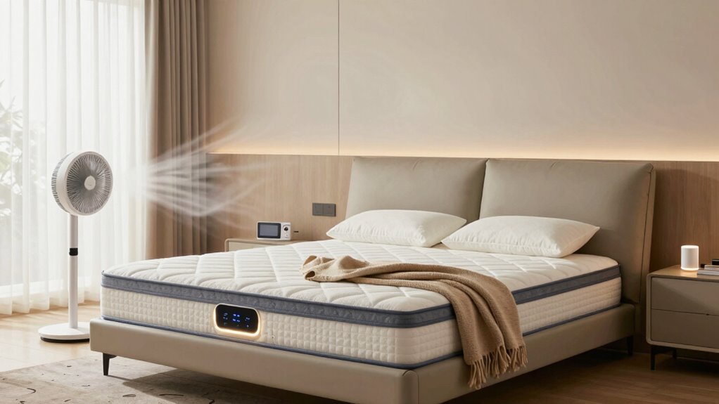 Choosing the right mattress cooling system can greatly enhance your sleep experience, especially as temperature preferences often shift with the seasons. I’ve found that effective systems offer temperature settings ranging from 54-115°F, which lets me adjust my comfort level throughout the year. Intelligent controls make shifts between cooling and heating seamless, ensuring I stay cozy no matter the weather. If you share a bed, dual-zone controls are a lifesaver, letting each of us customize our side. I appreciate options that use water circulation technology, cooling my mattress considerably more than room temperature. Plus, energy-efficient systems help keep electricity bills low, using far less power than traditional air conditioning. It’s a win-win for comfort and savings!