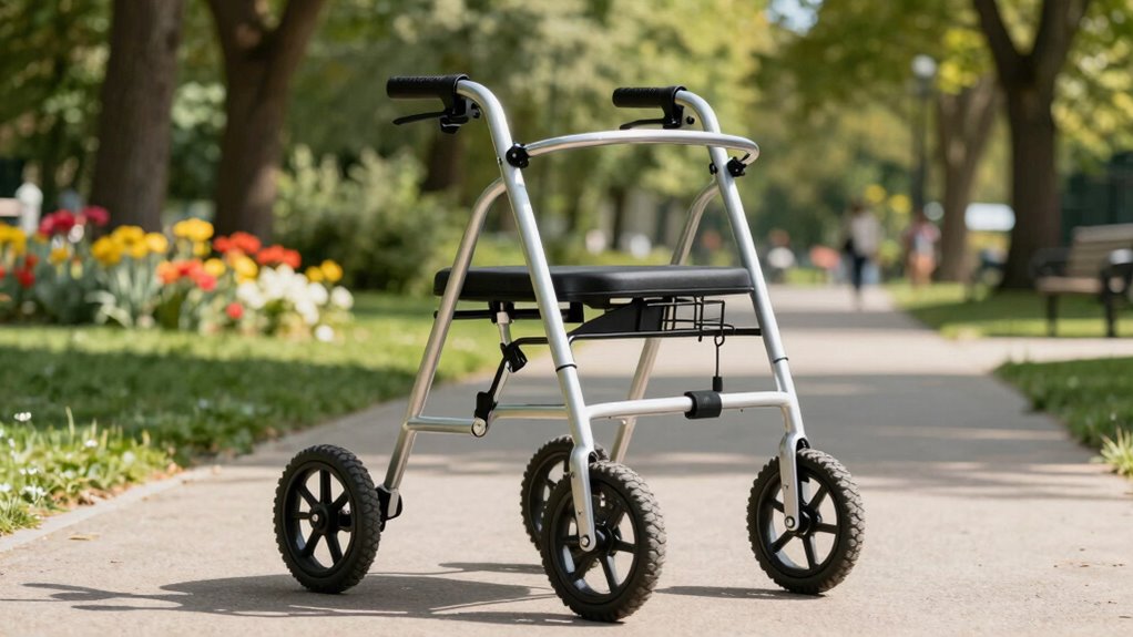 If you’re looking for the best rollator walkers with big wheels for outdoor use in 2026, I’ve found top options that combine durability, stability, and easy maneuverability. Many models feature large, all-terrain tires, adjustable height, and sturdy frames to handle gravel, grass, and rough paths. These walkers offer comfort, safety, and convenience with padded seats, storage pockets, and anti-slip brakes. Stay with me to discover detailed insights into each model and what makes them stand out.
