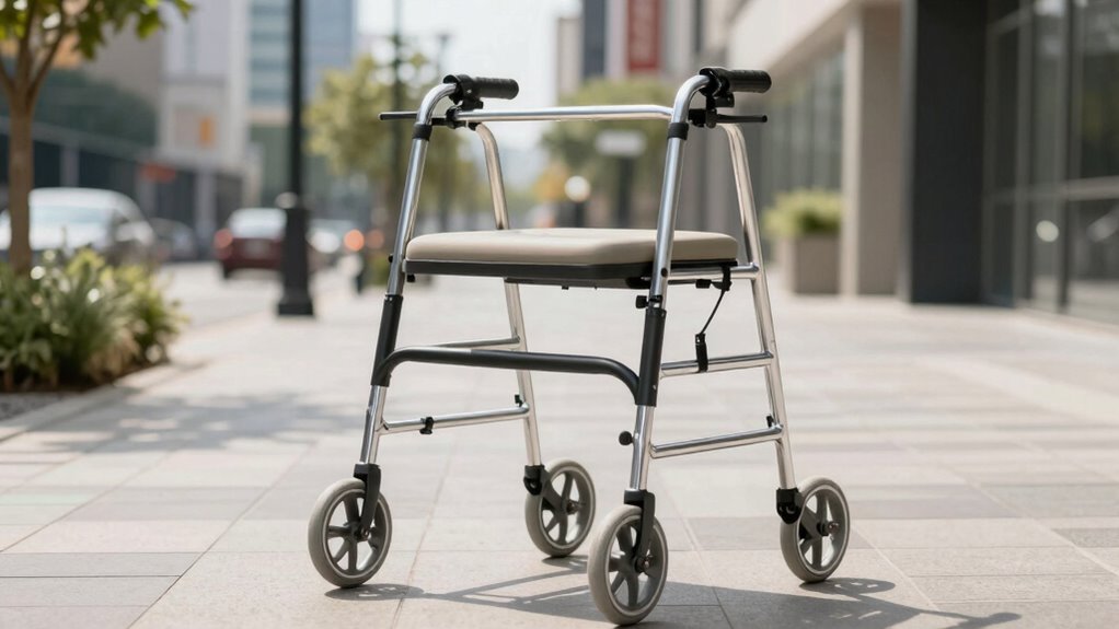 Think of safety features like the sturdy anchor that keeps a ship steady on rough seas. For all-terrain rollators, essential safety features include reliable brakes, sturdy tires for varied surfaces, and a secure locking mechanism. Reflective accents also enhance visibility in low light. These elements work together to guarantee stability and confidence, making every outdoor adventure safer and more enjoyable for you.