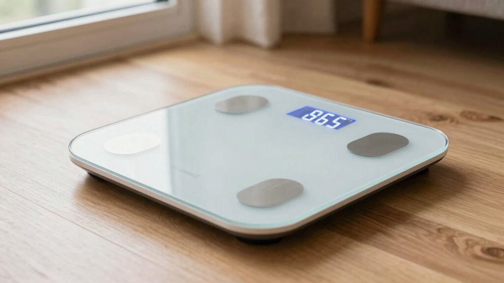 Choosing a smart scale with an easy-to-read display is essential for seniors, as it guarantees they can quickly and accurately interpret their health data without frustration. A large display with high-contrast text makes reading measurements effortless, even for those with visual impairments. Bright backlit screens improve visibility in low-light conditions, ensuring accurate readings any time of day. Clear, bold digits reduce confusion and allow for quick understanding of results. Some models also offer adjustable font sizes, accommodating users with varying degrees of visual ability. An intuitive interface with minimal buttons simplifies operation, preventing frustration and making daily use straightforward. Overall, a display designed with readability in mind helps seniors stay confident and independent while managing their health.