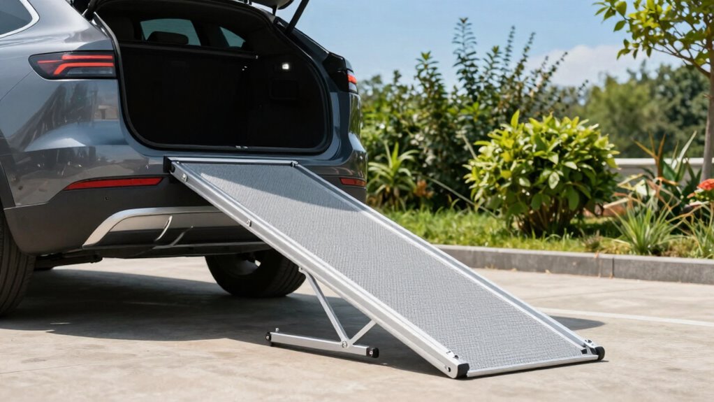 To determine the best ramp length for your SUV, I recommend measuring the height from the ground to your vehicle’s entry point. Then, add a few inches for safety and ease of use. Generally, a ramp that’s about 4 to 6 times the height provides a gentle incline. I always double-check my measurements and consider the user’s mobility to guarantee a smooth, safe passage.