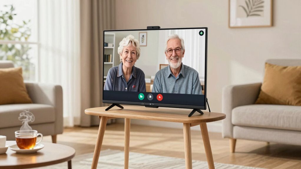 When selecting a large-screen video calling device for seniors, considering smart home integration can make a big difference in daily convenience. It allows seniors to control compatible devices like lights, thermostats, and doorbells directly from their device, boosting independence. Devices with built-in voice assistants enable hands-free operation of connected appliances through simple commands, making routine tasks easier. Seamless integration with popular smart home platforms allows for automated routines, such as turning on lights when a call begins, creating a more intuitive experience. Additionally, compatibility with various smart home ecosystems means seniors can expand their device network over time as needed. It’s also essential to choose devices that prioritize security and privacy, ensuring personal data remains protected while managing connected devices remotely.