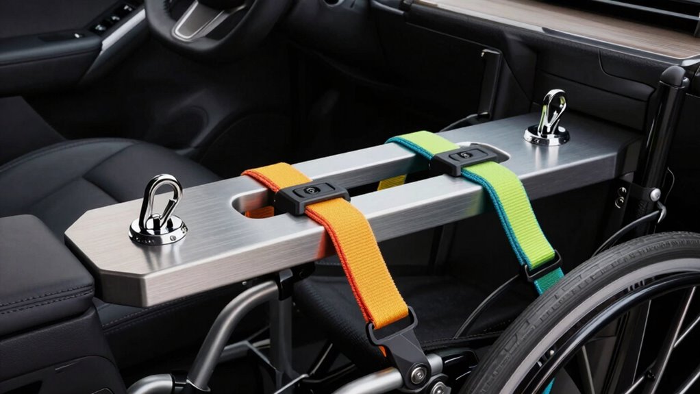 Choosing a wheelchair tie-down system that fits your vehicle’s specific setup is essential for safety and ease of use. First, check that the system is compatible with your vehicle’s anchoring points, like L-track, L-pockets, or Bevel track systems. Make sure the mounting hardware and fittings match your vehicle’s floor type and layout. It’s also important to verify that the system meets safety standards such as WC18/19, ISO 10542, or SAE J2249, relevant to your vehicle. Additionally, ensure that the components, including webbing and retractors, are suitable for your wheelchair’s size and weight. Finally, consider how easily the system can be installed and operated within your vehicle’s space constraints to guarantee a secure and user-friendly experience.
